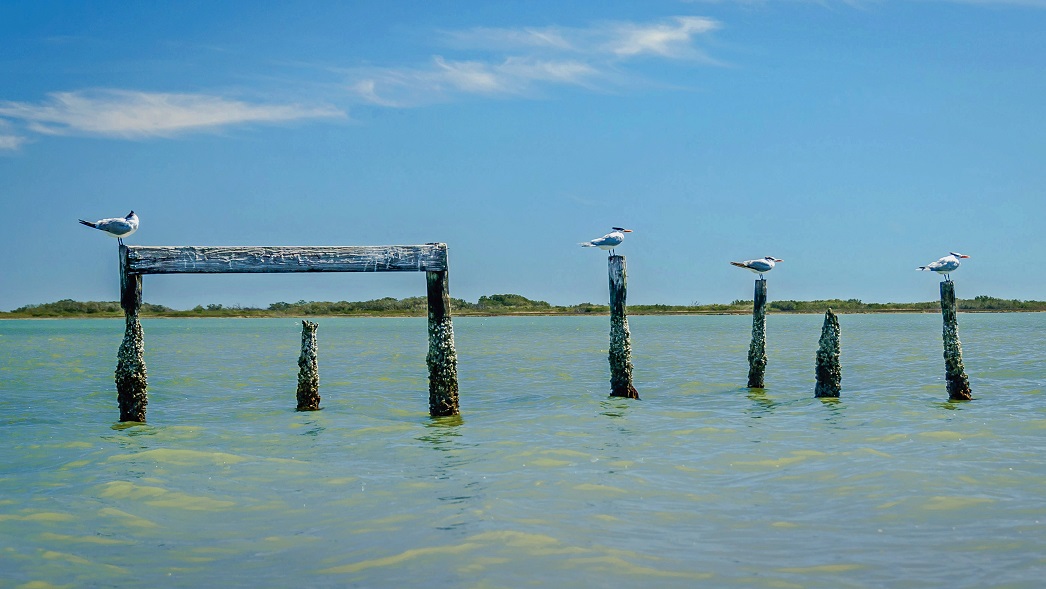 The bays and estuaries of the Aransas Bay complex offer many opportunities for exploration by kayak. They range from the upscale, suburban Little Bay to the working harbors of Fulton and Aransas Pass, to the modestly developed Copano Bay and undeveloped St. Charles Bay. The Aransas Bay complex covers about 112,000 acres and is separated from the Gulf of Mexico by San Jose Island. The average depth of Aransas Bay is eight feet; Aransas Channel is dredged to 12 feet. Most of the bottom is mud, sand and shell, and there are 840 acres of oyster reefs and 8,000 acres of seagrasses in the system. Major water exchange with the Gulf occurs through Aransas Pass (link).